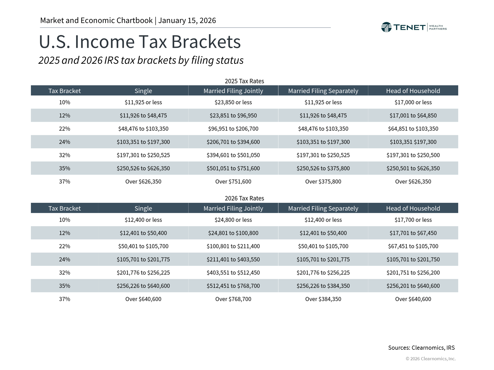 Tax planning is a foundational component of our services at Tenet Wealth Partners, and we believe it is an integral and impact part of a broader financial plan. Let’s dive into some of the key changes to be aware of for 2026.